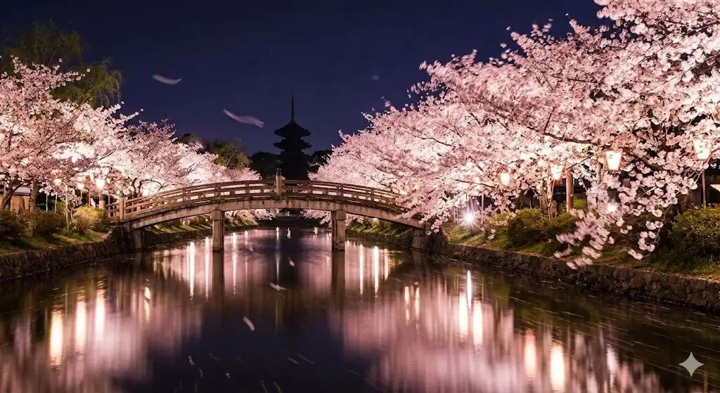 この写真は、長時間露光のテクニックを使っています。暗い夜、三脚でカメラを固定し、シャッタースピードを数秒〜数十秒と長く設定することで、水面に映る光を滑らかな線(光跡)として捉え、さらに風で揺れる桜の花びらを「ブレ」として表現しています。これにより、静寂な夜の空気感の中に、桜が舞い散る動的な美しさが共存する、幻想的な一枚になります。