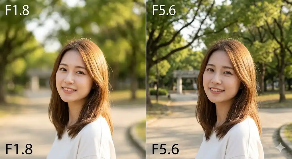 - F値が小さい(例:F1.8、F2.8): 絞りが大きく開いており、光を多く取り込めます。ピントが合う範囲が狭くなり、背景が大きくボケます。