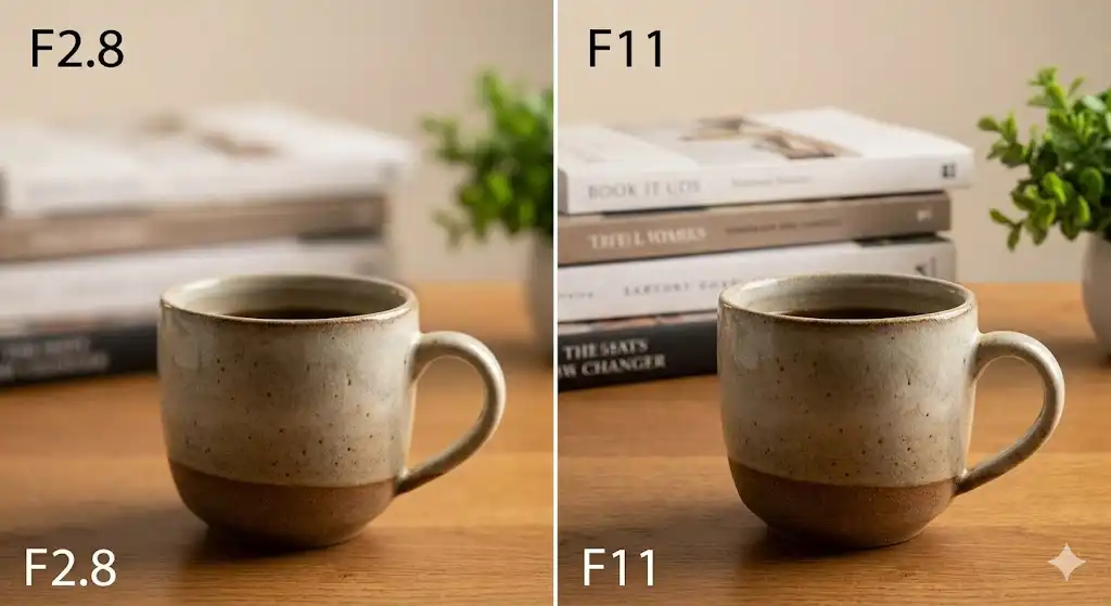 この写真(物撮り F2.8 と F11 の違い)を見ると、F2.8で撮影した左側の写真は、手前のコーヒーカップにピントが合っており、奥にある本や観葉植物が大きくボケています。F2.8の柔らかな雰囲気は、おしゃれなカフェのような雰囲気を作りたい場合に最適です。 一方、F11で撮影した右側の写真は、コーヒーカップ、本、観葉植物すべてにピントが合っています。F11で撮影すると、被写体の全体像をはっきりと伝えることができます。