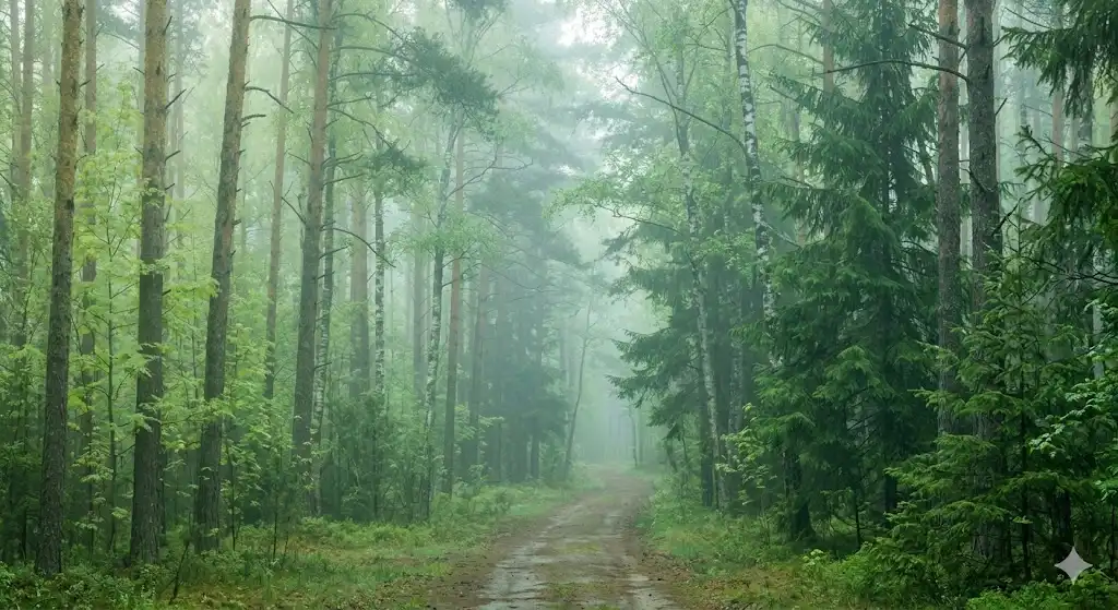 霧に包まれた朝の森です。画面全体が、淡い黄緑から深いエメラルドグリーンまでの「緑のグラデーション」で構成されています。特定の被写体が強く主張するのではなく、緑色という類似色の集まりが、森の静寂や奥深さ、そして一体感を表現しています。