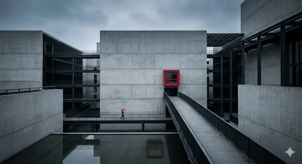 コンクリートと鉄骨で構成された、都会的でモノトーンな建築物。全体はグレーと黒のクールな色調でまとまっています。しかし、画面の中央、3階部分にある一つの窓枠だけが、鮮やかな「赤」に塗られています。このたった一つの赤い点が、画面全体を引き締め、見る人の視線を瞬時にそこへ釘付けにします。