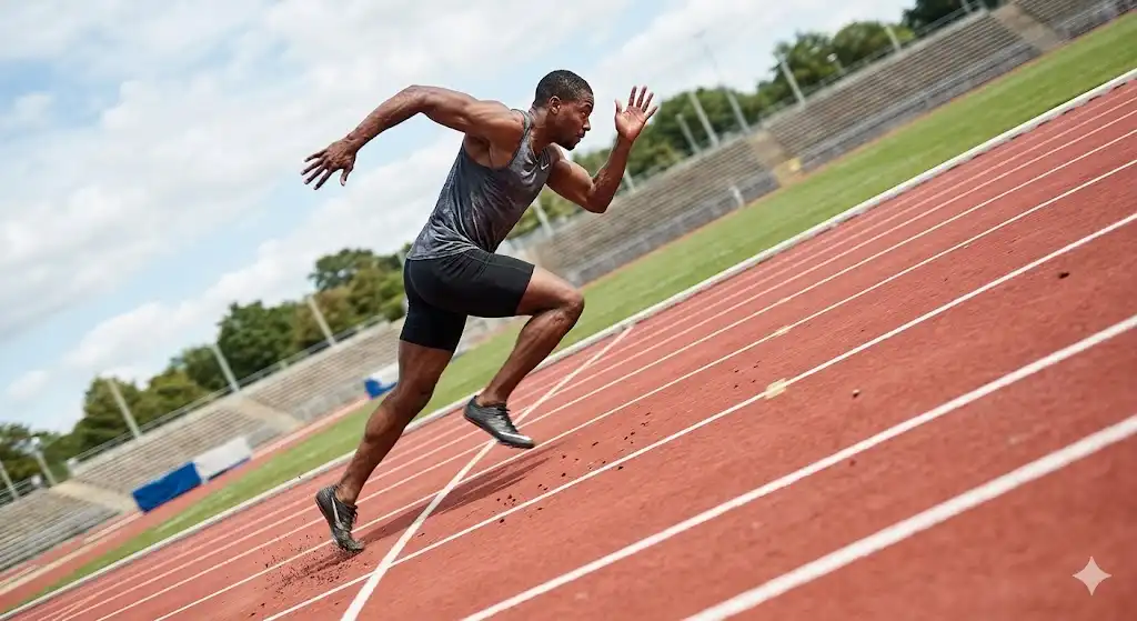 この写真では、カメラを大きく傾けることで、ランナーが左下から右上に向かって対角線上に配置され、凄まじいスピード感と躍動感が伝わってきます。背景のトラックの白線や観客席のラインがすべて斜めに傾き、それが不安定さと緊張感を生み出し、脳がそれを「速さ」として認識するのです。
