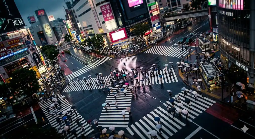 • イメージ: 都会のスクランブル交差点を、見下ろす角度から斜めに撮影。雨上がりの濡れた路面に、無数の傘の花が咲き、行き交う人々の影が長く斜めに伸びている。カメラを傾けることで、街の喧騒と、人々の動き、時の流れが複雑に交差する様子を表現。