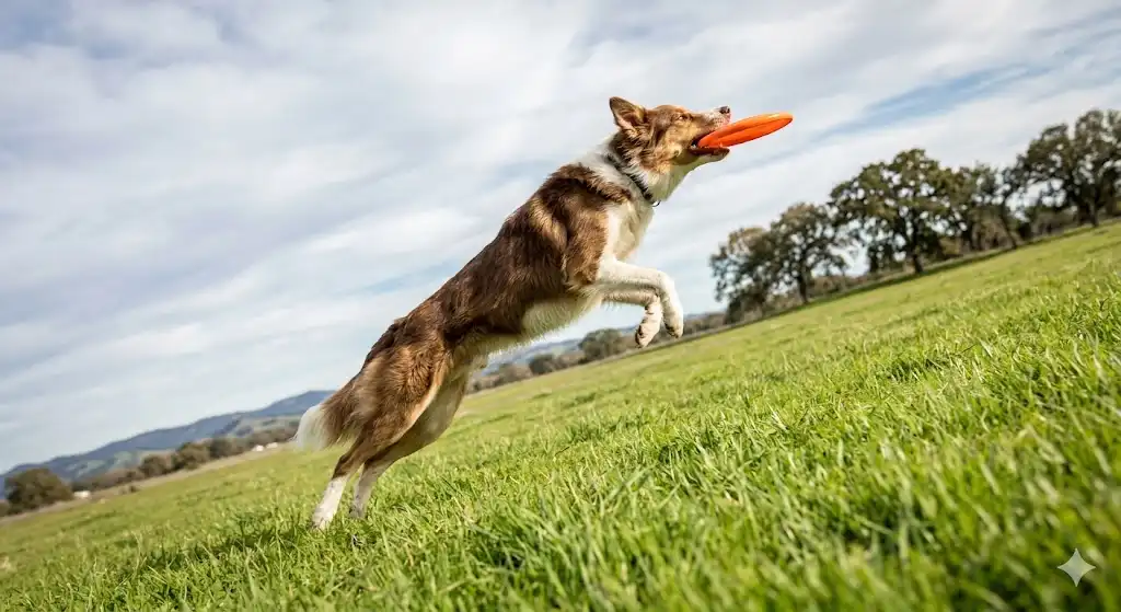 • イメージ: 草原で、空中に浮かんだフリスビーに向かって、犬がダイナミックにジャンプしている。カメラを傾け、犬の体が左下から右上に向かって対角線上に配置。犬の表情は真剣で、筋肉が躍動している。背景の草や空の雲も斜めに傾き、空中の疾走感を強調。