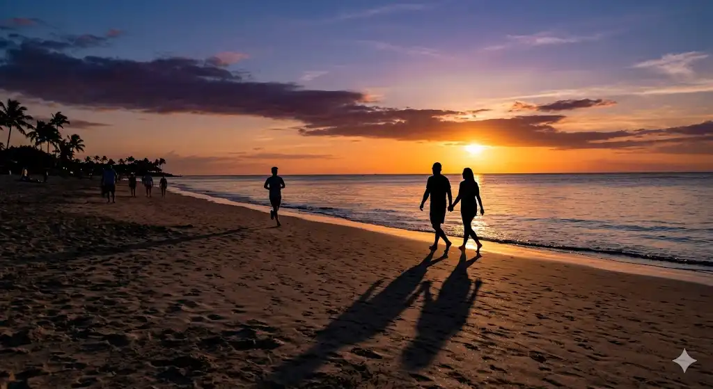 この写真は、夕日が沈む直前の海岸線で、複数の人々のシルエットがドラマチックに切り取られています。 夕日の強い光が背景の空を明るく照らし、被写体である人々の輪郭が黒く際立っているのが分かります。 カップルが手を繋いで歩く姿、走る人、そして遠くのヤシの木のシルエット。 それぞれの「形」が、それぞれの物語を語っているようです。 また、濡れた砂浜に伸びる長い影も、この瞬間の光の強さと、時間の経過を感じさせてくれます。 このように、シンプルな被写体と背景でも、逆光を活かすことで、非常に印象的な写真を撮ることができます。