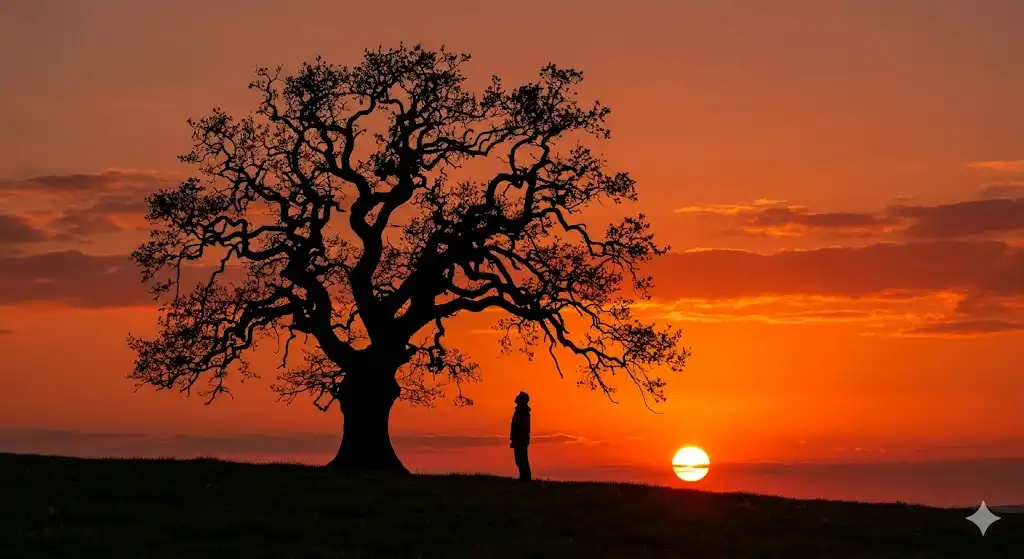 この写真では、夕暮れ時の丘の上に立つ、複雑にねじれた枝を持つ老木のシルエットが描かれています。 夕日は地平線にあり、空全体を燃えるようなオレンジ色と赤色に染めています。 この写真では、意図的に露出を低く設定することで、背景の空の色彩をより深く、力強く表現し、同時に老木の枝ぶりを完全な黒いシルエットとして際立たせています。 もし自動露出のままで撮影していたら、カメラは老木の枝を少しでも明るく見せようとし、結果として背景の空の色彩が薄くなり、シルエットの力強さも半減していたでしょう。 被写体の形が複雑であればあるほど、露出を適切に調整し、背景と被写体のコントラストを明確にすることが重要になります。 露出調整(露出補正)の方法は、カメラやスマートフォンによって異なりますが、一般的には「±」のボタンや画面上のスライダーで調整できます。 まずは、「-1」や「-2」に設定して、シルエットがどのように変化するか試してみてください。