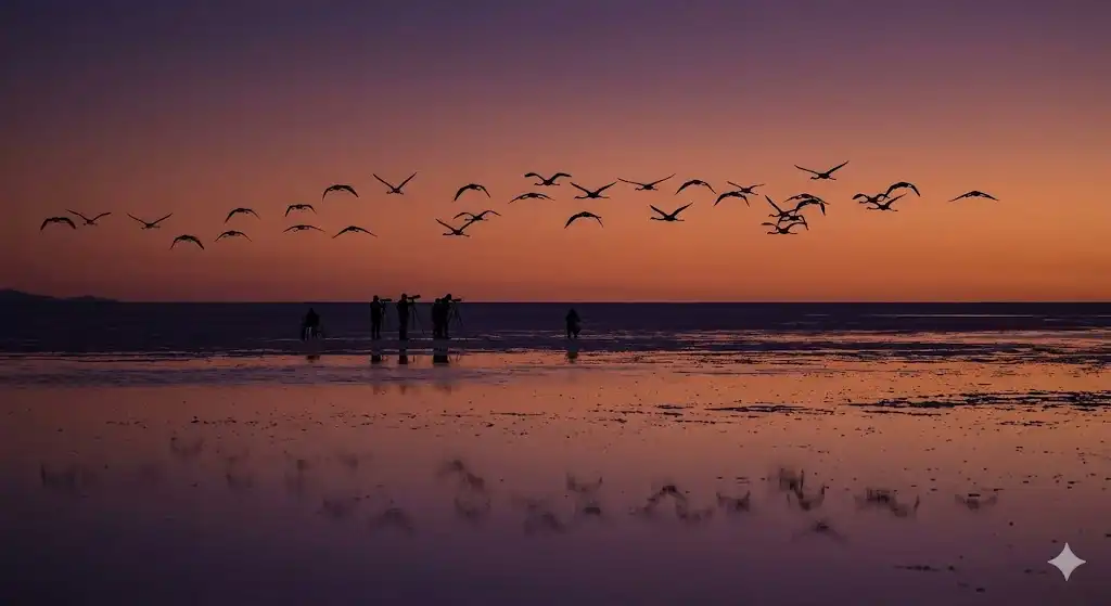 最後に、夕日の前を横切る鳥の群れが、より広い視点から捉えられた写真を見て、この記事を締めくくりましょう。