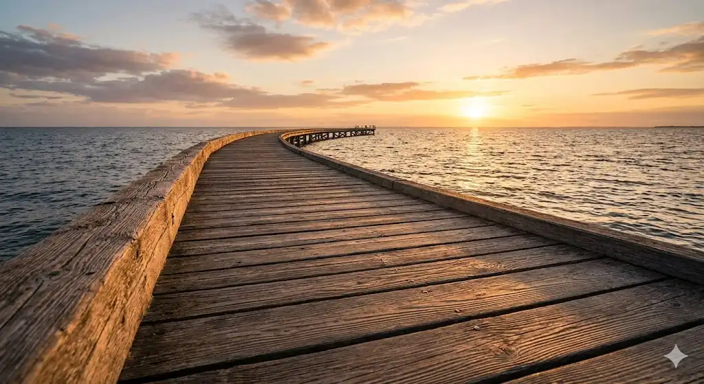 この写真(リーディングラインの活用例:夕暮れの海辺の木道)では、木道が左手前から奥へと延びています。 見る人の視線は、この木道に沿って自然と奥へと移動し、その先にある夕焼けと水平線に引き込まれます。 このように、線が奥へと続く様子を描写することで、写真に奥行きと広がりを生み出すことができます。