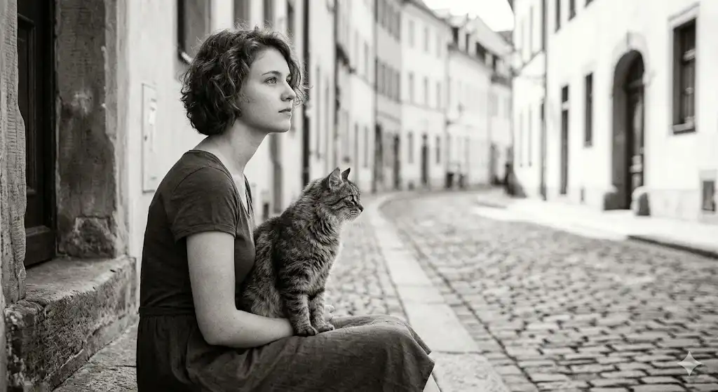 この写真(視線の力:遠くを見つめる少女と猫)では、少女と猫が同じ方向(右側の画面外)を見つめています。 見る人の視線は、まず少女と猫に引き寄せられ、そこから彼らの視線の先にある何かを追いかけようとします。 このように、被写体の視線を利用することで、写真にストーリー性や奥行きを生み出すことができます。