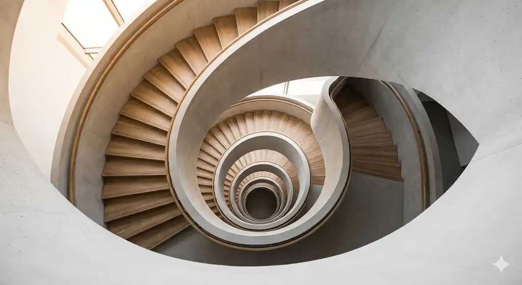 この写真(幾何学的なリズム:螺旋階段のパタン)では、螺旋階段が描く渦巻き状のパターンが繰り返されています。 見る人の視線は、この渦巻きに沿ってぐるぐると回り、中心へと引き込まれます。 このように、幾何学的な配置を利用することで、写真に動きとリズムを生み出し、見る人を引きつけることができます。