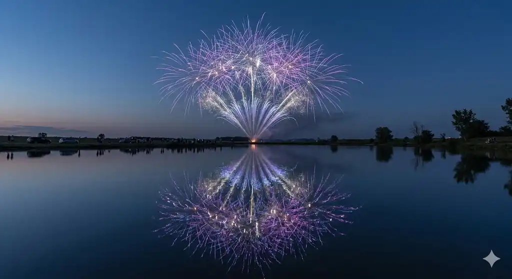 続いて、こちらの写真(水面に映る夢)をご覧ください。 これは、構図を工夫することで、よりドラマチックな写真を撮るための例です。 打ち上げ場所の近くにある池を前景に配置し、花火が水面に映る「逆さ花火」を狙いました。 水面に映る花火の光が、ゆらゆらと揺らめき、幻想的な雰囲気を醸し出しています。 このように、周囲の景色と組み合わせることで、花火単体の写真とは違った、魅力的な写真を撮ることができます。