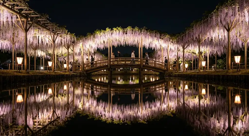 藤の季節、多くの名所で「夜間ライトアップ」が開催されます。昼間の美しさとは一味違う、艶やかで幻想的な夜の藤棚は、写真好きにとって見逃せない撮影チャンスです。