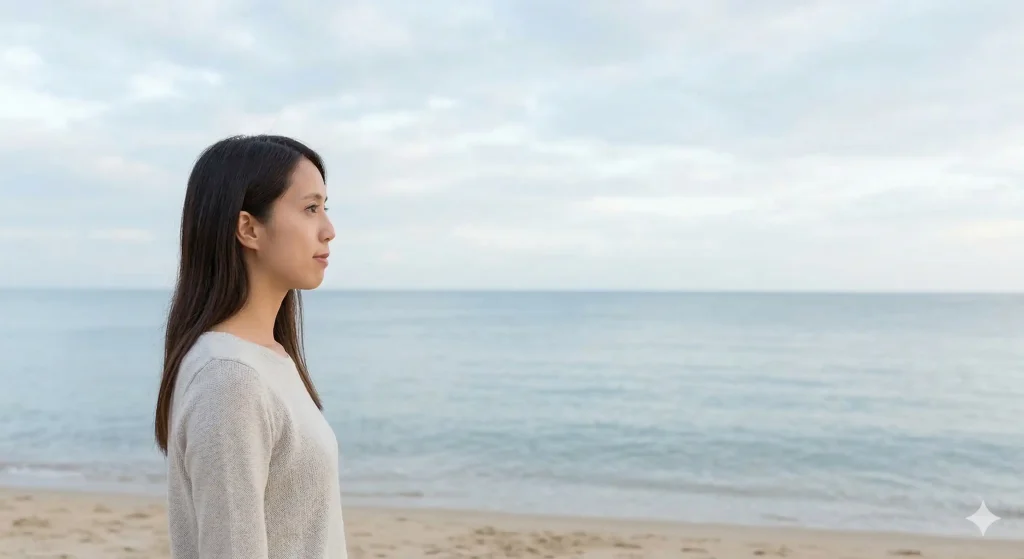 海辺に立つ女性が、画面の右側(広い空間)を見つめています。