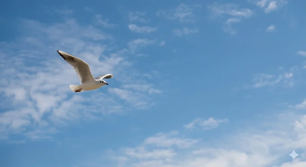 カモメが、広い青空に向かって左から右へと飛んでいます。