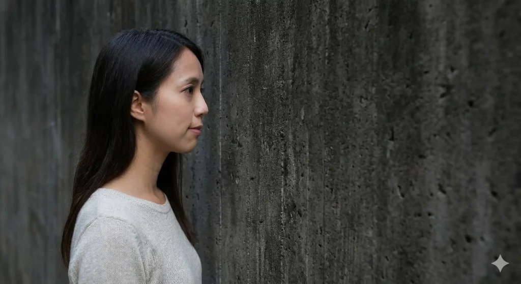 最初の写真(海を見つめる人)と同じ女性ですが、印象は全く異なりますよね。 この写真(行き止まりの視線)からは、彼女が感じているであろう圧迫感、閉塞感、あるいは孤独感、何かに迷っているような複雑な心情が伝わってきませんか?