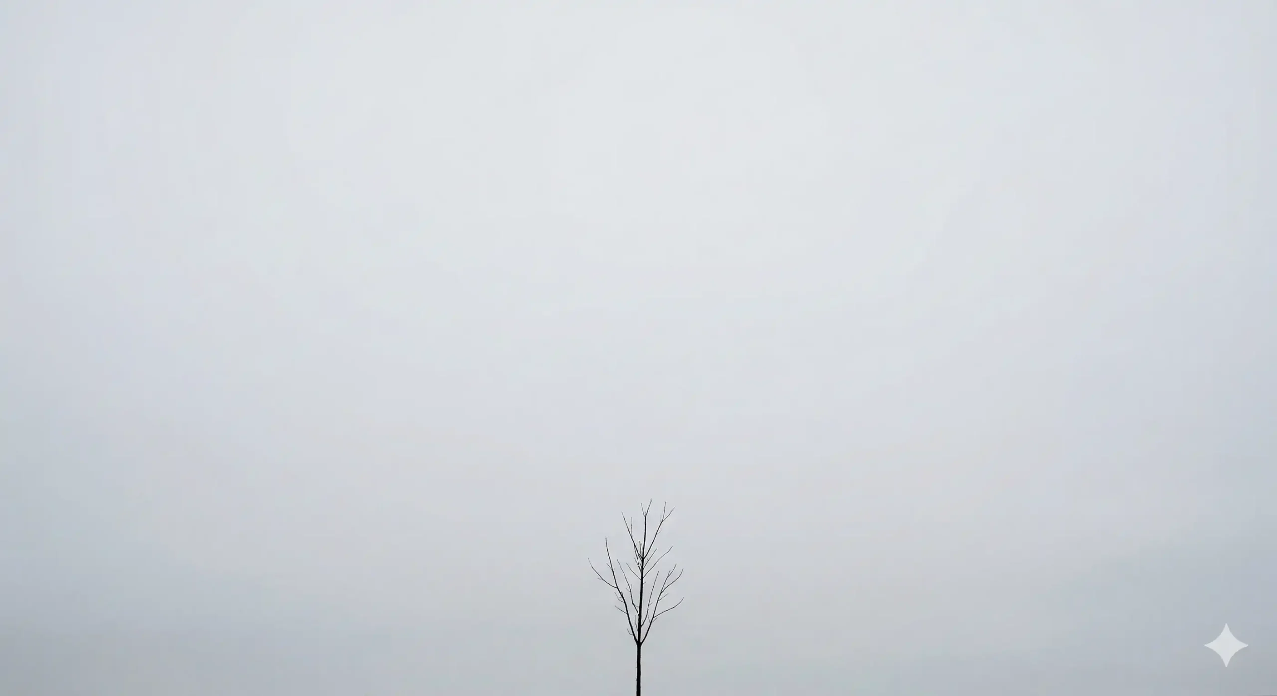 この写真(広大な空白)では、画面のほとんどが、曇り空のグレーで占められています。その広大な空間の中に、一本の細い木の幹と枝が、ぽつんと配置されています。