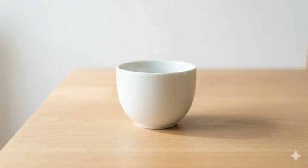 この写真(ひとつの器)では、滑らかな木のテーブルの上に、白い陶器のカップが一つだけ置かれています。背景は、白壁で、何もない。