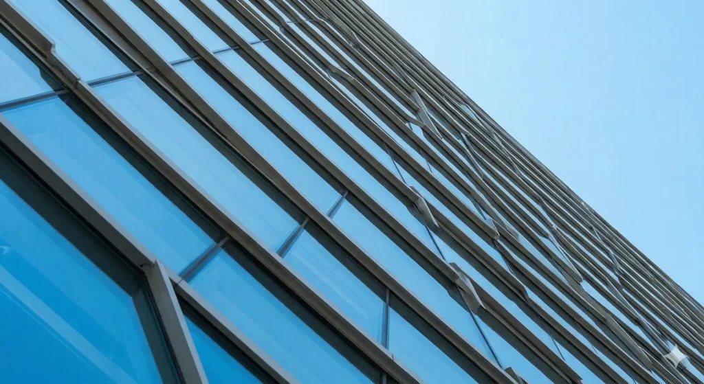 この写真(都市の幾何学)では、現代的なビルの外壁を、斜めに切り取ることで、繰り返される直線、対角線、そしてガラスの四角形が、幾何学的なパターンを形成しています。