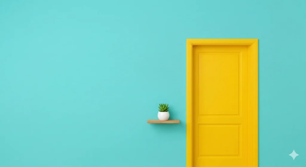 この写真(色の調和)では、鮮やかなターコイズブルーの壁を背景に、黄色いドアが一つだけ配置されています。壁とドアの色が、鮮やかにコントラストを形成し、見る人に「明るさ」「楽しさ」「現代」といった、感情を想起させます。