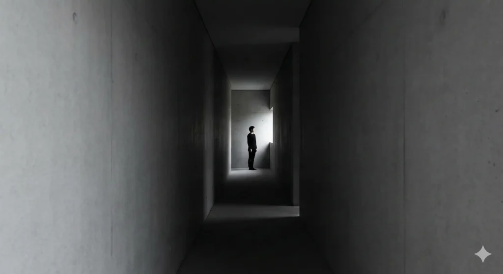 この写真(影の対話)では、現代的なビルの長い廊下を、深く影に落とすことで、光と影の「対話」を表現しています。廊下の先に、一つの人物が、シルエットになって立っています。