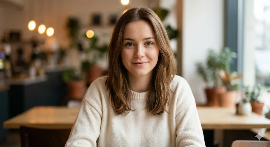 この写真では、カフェの窓辺に座る女性を中央に配置しています。F値(絞り)を開けて背景を大きくぼかすことで、周囲の雑多な要素を消し去り、主役である女性の表情に完全に視線を集中させています。