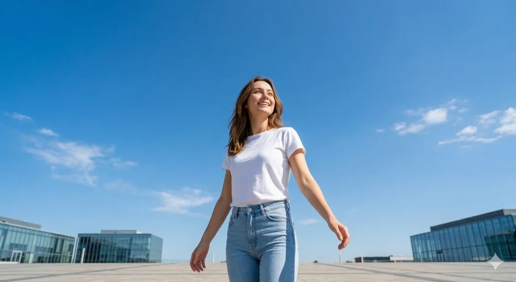 この写真では、カメラを地面に近い位置に構え、モデルを下から見上げて撮影しています。このアングルによって、モデルが空を仰ぐ姿がより強調され、解放感と躍動感にあふれる一枚になっています。