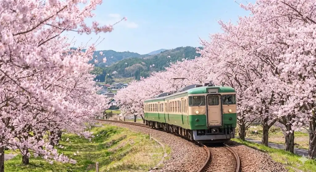 この写真では、満開の桜並木を背景に、カラフルな列車が走っています。 列車を小さく配置することで、むしろ桜の美しさと、その中を走る鉄道という、物語性のある風景として捉えることができます。 このように、季節の要素や、その土地特有の景色と組み合わせるのも、鉄道写真の大きな魅力です。